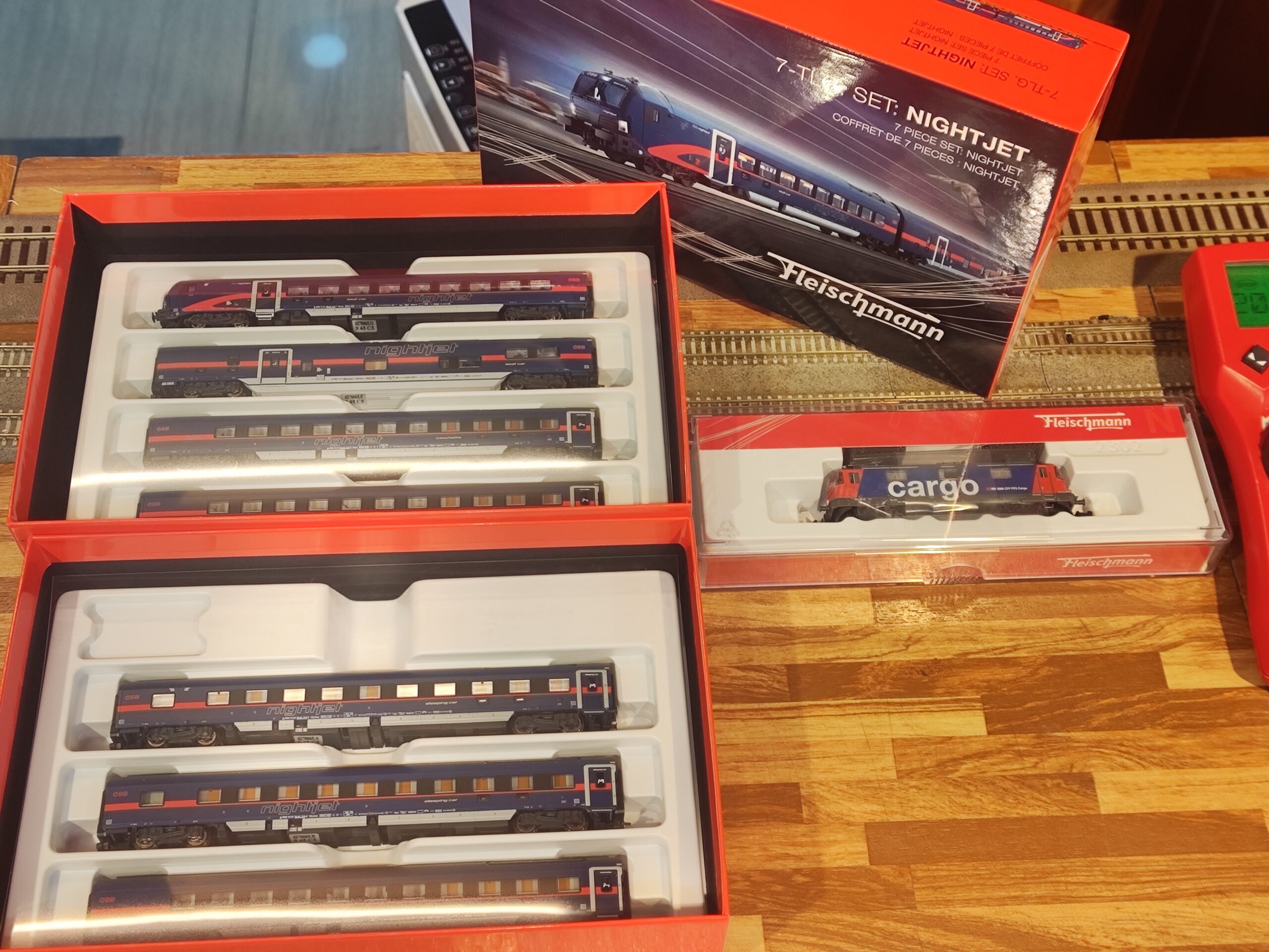 The set contains one end sleeping coach, type WLAmz, one sleeping coach, type WLAmz, three couchette coaches, type Bcmz, one multifunction coach, type ABbmpvz and one cab control coach, type Bfmpz.